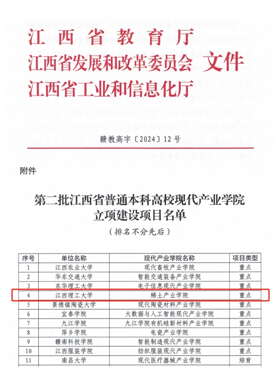 本网讯 近日,省教育厅、省发展和改革委员会、省工业和信息化厅联合下发《关于公布第二批江西省普通本科高校现代产业学院立项建设项目名单的通知》,裸聊直播 申报的“稀土产业学院”成功获批第二批普通本科高校现代产业学院立项建设重点项目。
