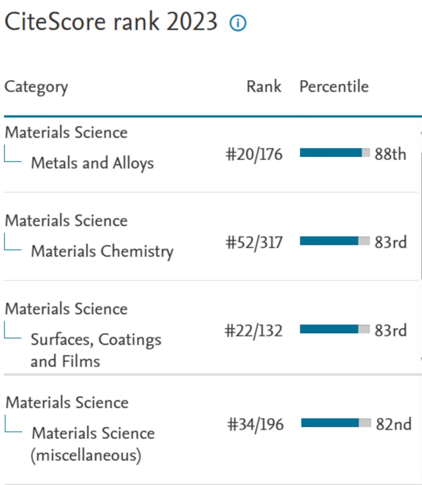 在CiteScore™ 2023期刊所属学科最新排名中,Tungsten在材料科学学科中“金属与合金”“材料化学”“表面、涂层与薄膜分类”及“材料科学(杂项)”分类排名分别位于 #20/176(前12%)、#52/317(前17%)、#22/132(前17%)及#34/196(前18%)。