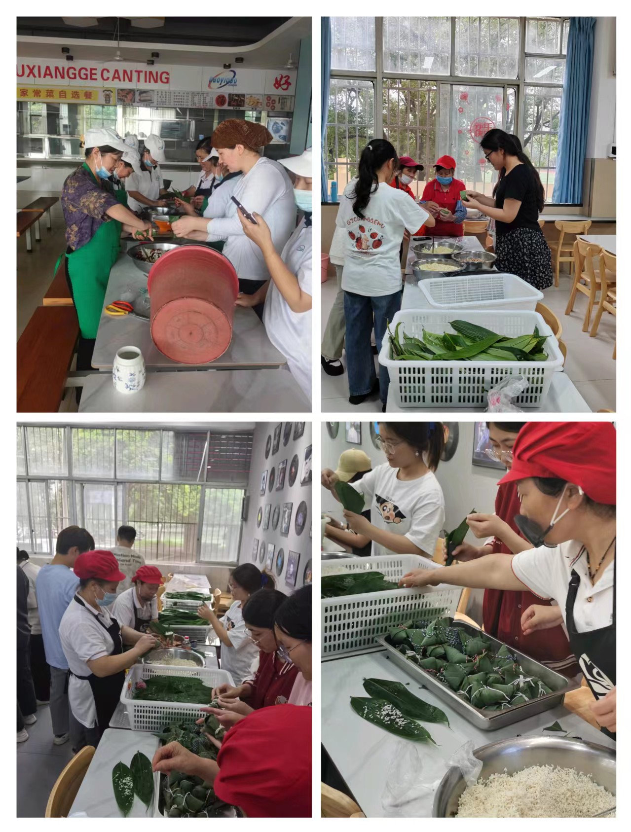 为了让同学们感受浓厚的传统节日氛围和校园的浓情温暖,各个食堂还联合学工部组织食堂员工和同学们一起包粽子。洗粽叶、折粽叶、填糯米、放馅料、封口子、扎藤绳……,粽叶层层叠叠,包裹着精心挑选的米与馅,活动现场满载着欢声笑语。