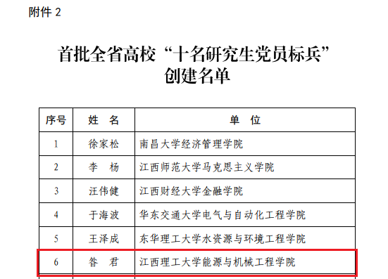 材料科学与工程学院研究生第一党支部入选首批全省高校“十个研究生样板党支部”创建名单,能源与机械工程学院博士研究生昝君入选首批全省高校“十名研究生党员标兵”创建名单。