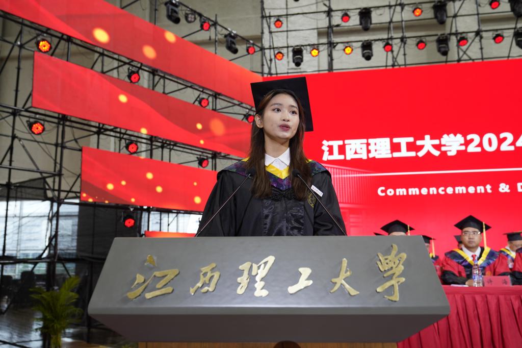 毕业本科生代表,江西省金相技能知识竞赛一等奖、金力永磁奖学金、“五好学生”获得者、稀土学院稀土工程(金属材料工程)201班邱文婕同学分享了四年大学生活充实又难忘的点点滴滴:图书馆奋笔疾书埋头苦读的日日夜夜,实验室里为一个实验数据反复重试,竞赛反复推敲每一个细节,第一篇论文的发表,四年收获了两次金力永磁奖学金及六次校级奖学金......她表示,将秉承“志存高远、责任为先”的校训精神,保持江理学子金属般的风骨,将青春奋斗的汗水播撒在祖国的四面八方!