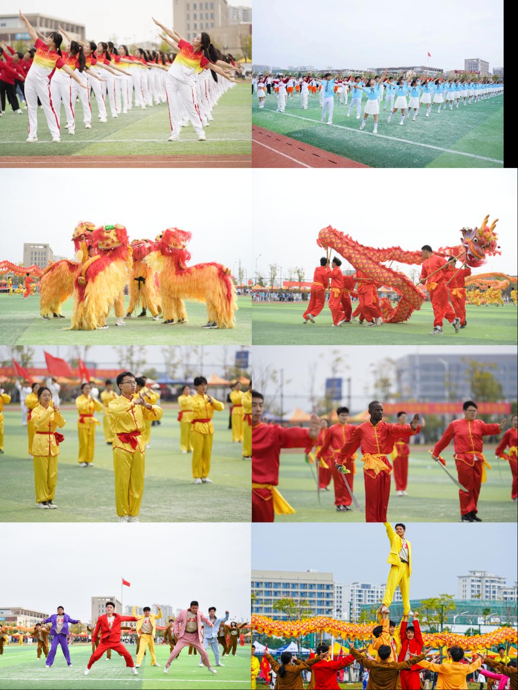 开幕式上,来自不同学院理工学子表演了“理工阳光操”,龙狮队、武术协会带来了技术高超的舞龙舞狮和刚柔并济的武术表演,校健美操队开展了啦啦操表演。