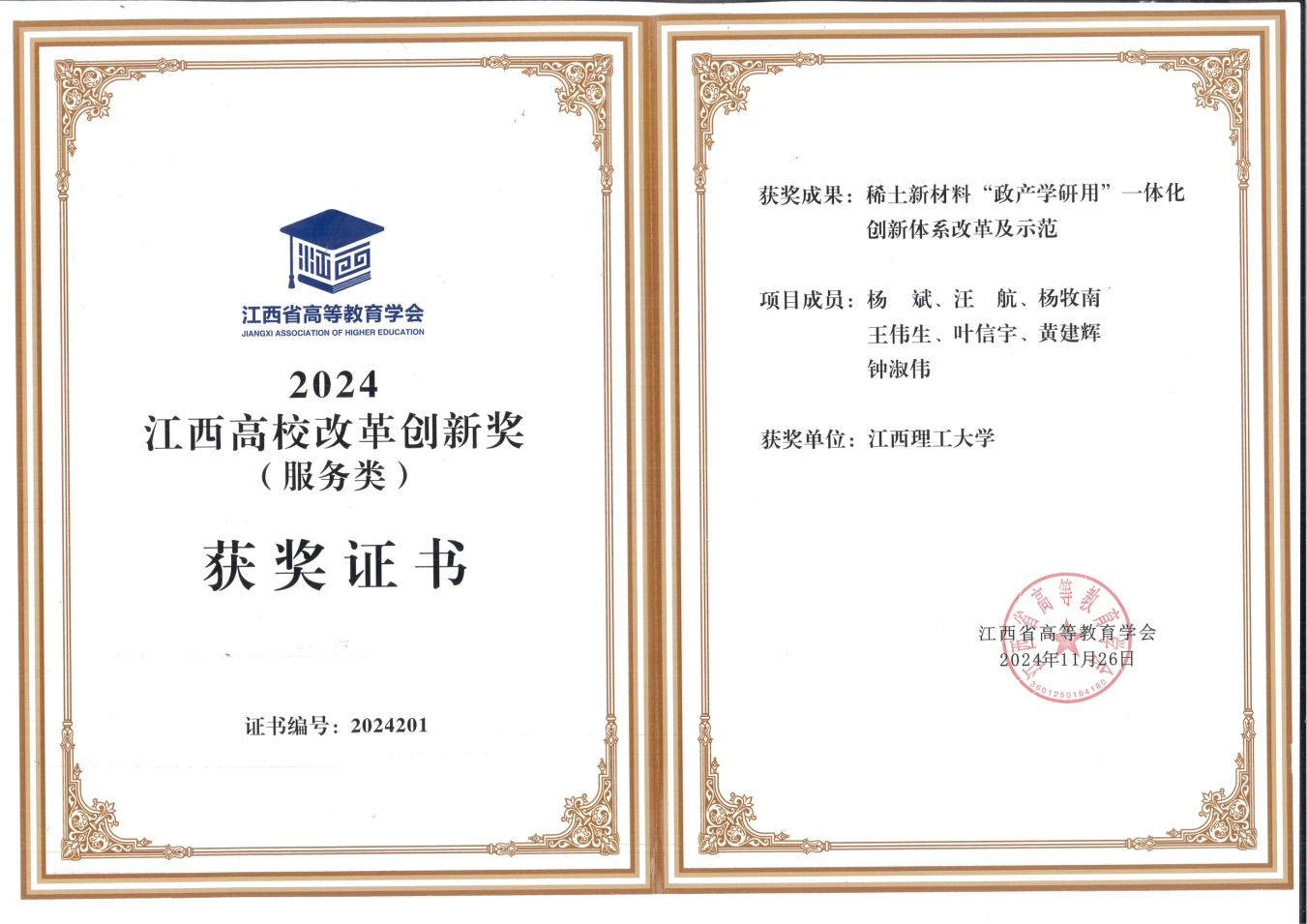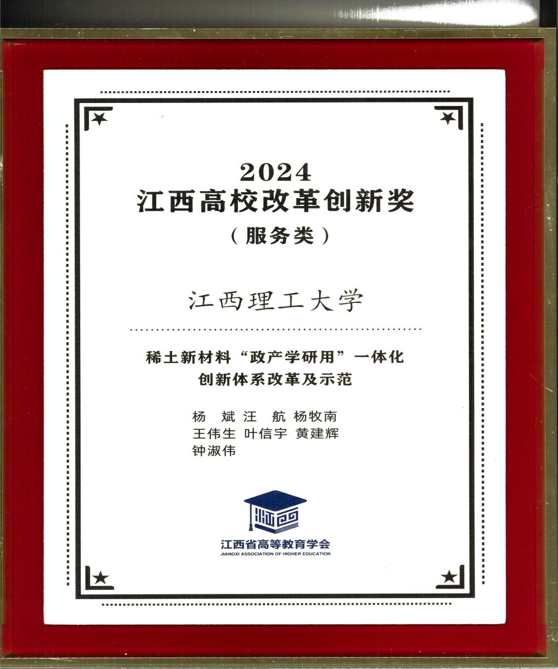 《稀土新材料“政产学研用”一体化创新体系改革及示范》项目荣获2024年江西高校改革创新奖(服务类)大奖。11月28日,在颁奖仪式上,省委教育工委委员、省教育厅副厅长、省高等教育学会会长刘小强为获奖单位颁奖,裸聊直播