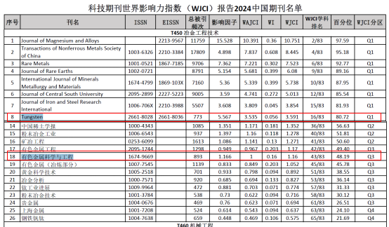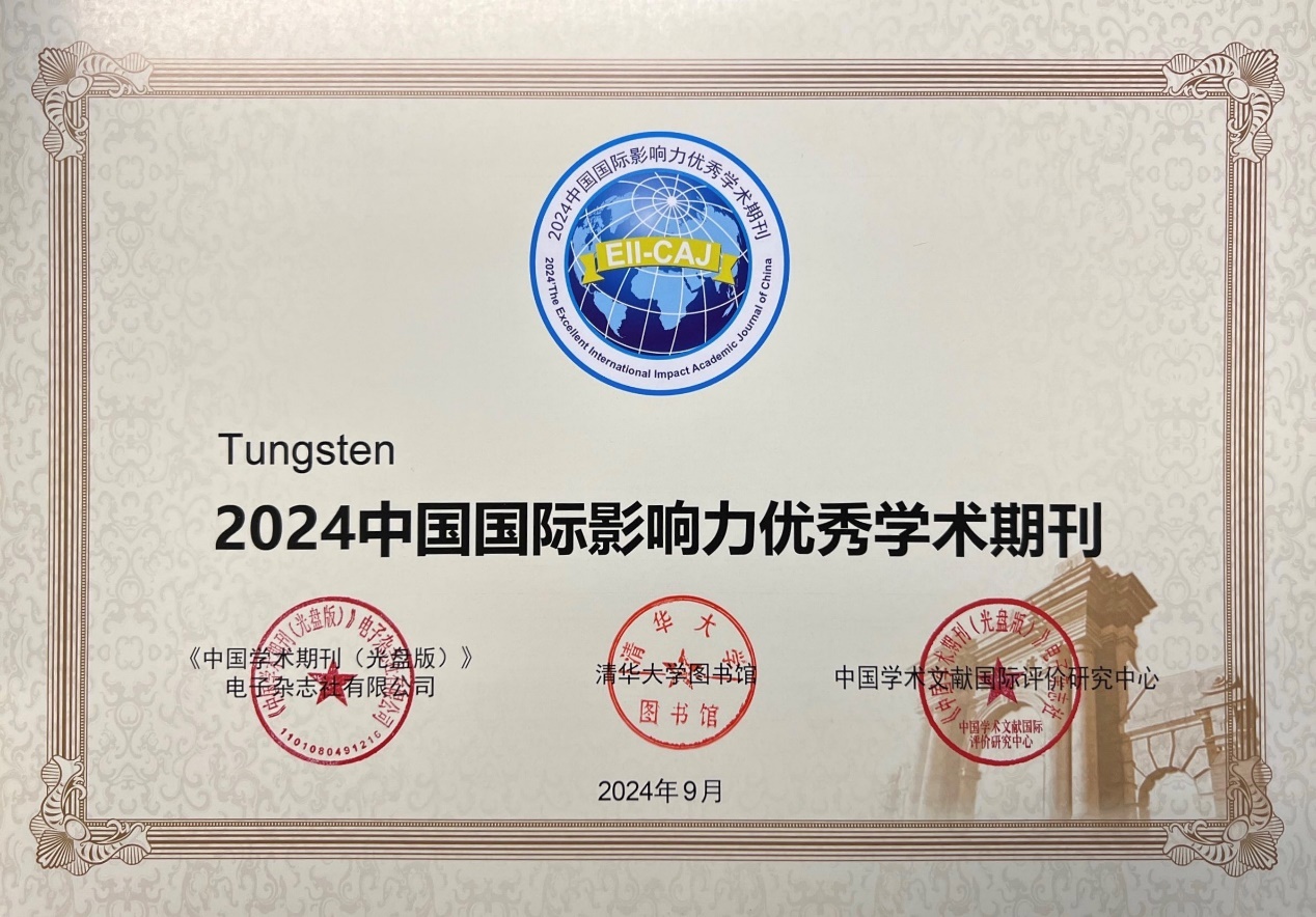 主办中英文期刊《钨科技(英文)》和《有色金属科学与工程》再度被《WJCI报告》收录,并在《WICI报告2024中国期刊名单》的冶金工程技术分类中分别位列Q1区和Q3区,全国近百本冶金工程技术类中英文期刊仅26本入选。此外,《钨科技(英文)》在《中国学术期刊国际引证年报》中被评选为“2024中国国际影响力优秀学术期刊”(简称TOP期刊),从7138种中国科技英文、科技中文、社科英文、社科中文学术期刊中脱颖而出。