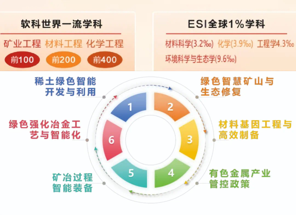 学校学科建设坚持“面向有色、聚焦稀土、突出特色、分层建设、内涵发展”理念,以建设稀土领域世界一流学科为目标引领,统筹推进博士点申报、“双一流”建设以及研究生教育发展,着力构建学科建设与研究生教育新高地。