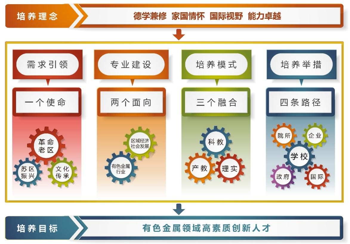 本科专业设置与建设管理办法》进行了修订,从而在制度层面为有色金属产业链的人才培养提供了坚实的保障。二是打造稀土领域特色专业链,服务有色金属行业发展。通过围绕有色金属领域,学校构建了一系列涵盖地质工程、采矿工程、矿物加工工程、材料物理、材料化学、无机非金属材料、金属材料工程、冶金工程、化学工程与工艺、机械工程、环境工程、法学以及信息科学等专业的人才培养链。同时,学校积极与赣州、鹰潭等有色金属产业的核心区域进行对接,建立了产业学院和产业研究院,探索出了校政企协同育人的新模式。三是优化学科专业群,服务江西数智创新人才培养。围绕矿业工程、冶金工程和材料科学与工程这三个一流学科,学校形成了绿色矿业、现代冶金、先进材料、智能装备、稀土领域以及人文社科等六大本科专业群。这些专业群不仅多维度地对接并落实了江西省的“1269”行动计划,还通过撤销9个本科专业、压减停招19个本科专业的方式,使得招生专业中与江西经济社会发展紧密相关的学科专业比例达到了90%以上。