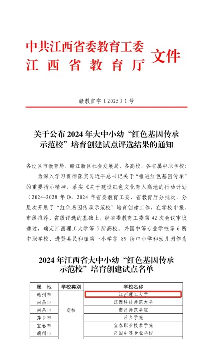 本网讯 近日,中共江西省委教育工委、江西省教育厅公布了2024年大中小幼“红色基因传承示范校”培育创建试点评选结果,裸聊直播