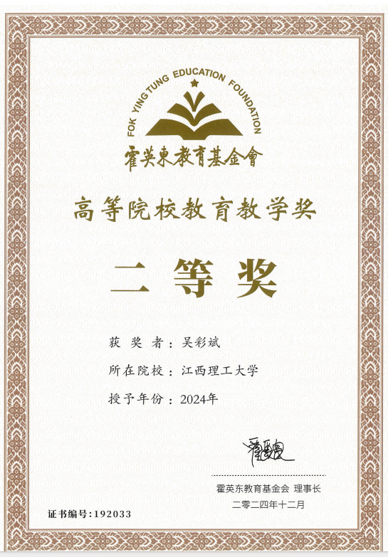 在教学方面,吴彩斌教授始终坚持教书育人,注重培养学生的综合素质。他主讲的多门课程深受学生欢迎,尤其是《粉体工程》,紧密结合行业前沿,注重理论与实践相结合,培养了大量的高素质人才。他还积极推动教学改革,提出了“项目驱动式”教学模式,主持了多项国家级和省部级教学改革项目,荣获国家教学成果二等奖1项,江西省教学成果特等奖1项、一等奖1项、二等奖4项,江西省优秀教材一等奖1项、中国冶金优秀教材一等奖1项,国家级一流课程1门,入选全国优秀教材先进个人、宝钢优秀教师,发表了多篇高水平教改论文,出版了多部教材和专著。吴彩斌教授在教育教学改革方面的贡献得到了广泛认可,其教学成果不仅提升了学校教学质量,更为全国高校教学改革提供了宝贵经验。作为学生成长的引路人,吴彩斌教授始终坚持以学生为中心。他指导的学生团队在各类科技创新竞赛中屡获佳绩,多次斩获国家级和省部级奖项。近五年来,他累计发放研究生、本科生补助50余万元,资助1名家庭困难学生,用实际行动支持学生成长成才。