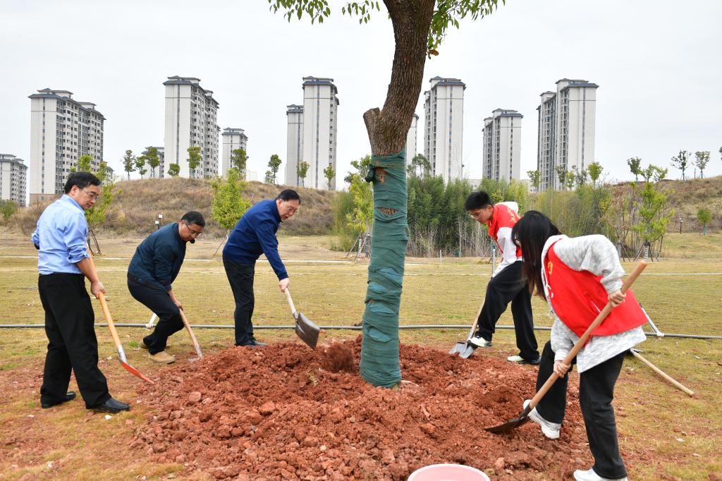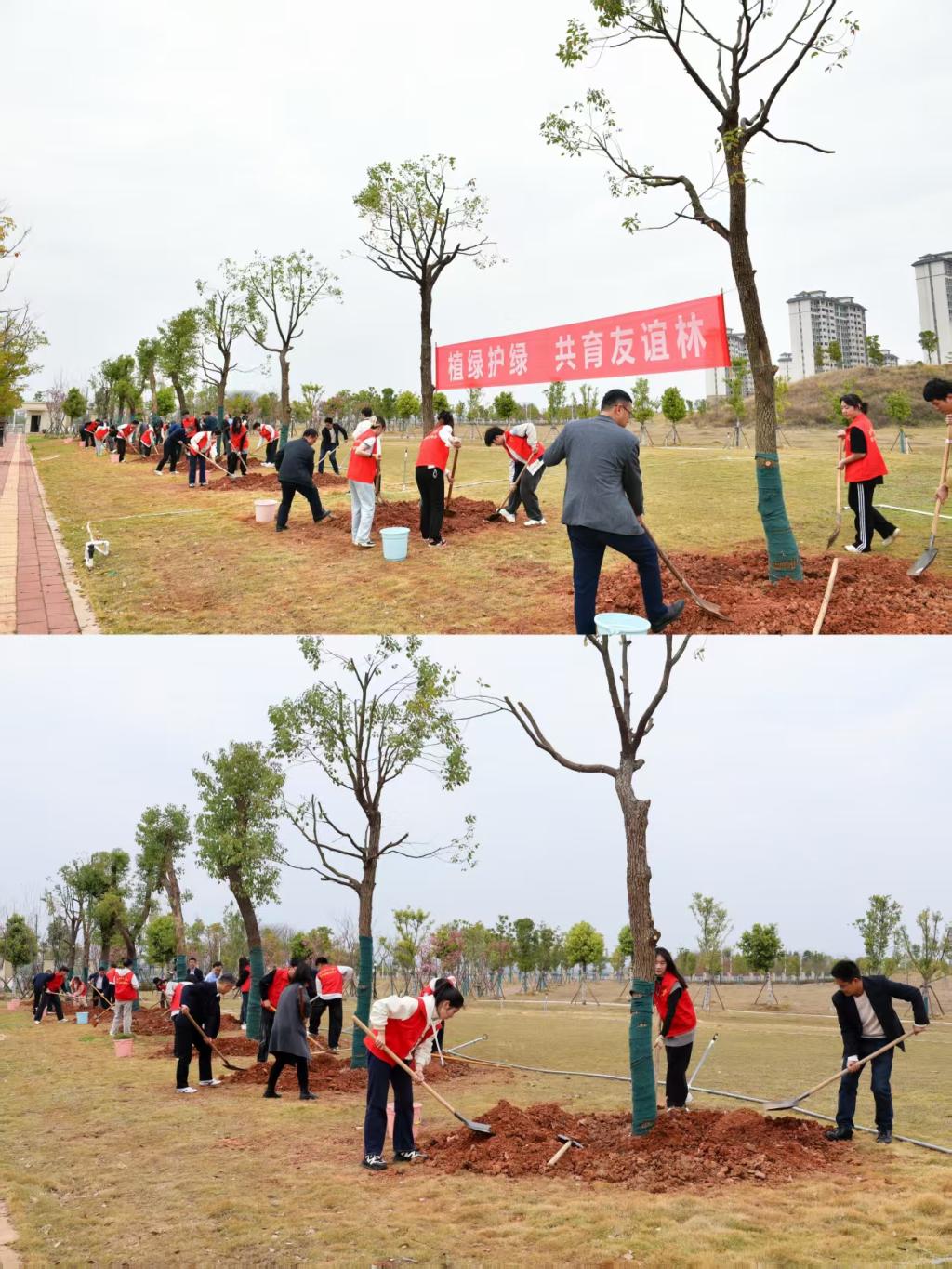 在三江校区(东园)北华门两侧绿地开展“植绿护绿,共建友谊林”主题植树活动。在家校领导杨斌、黄志繁、董冰岩、熊志华、刘飞,党委常委盛晓明、汪锋锁及师生代表参与活动,以实际行动践行绿色发展理念,为校园增添盎然生机。