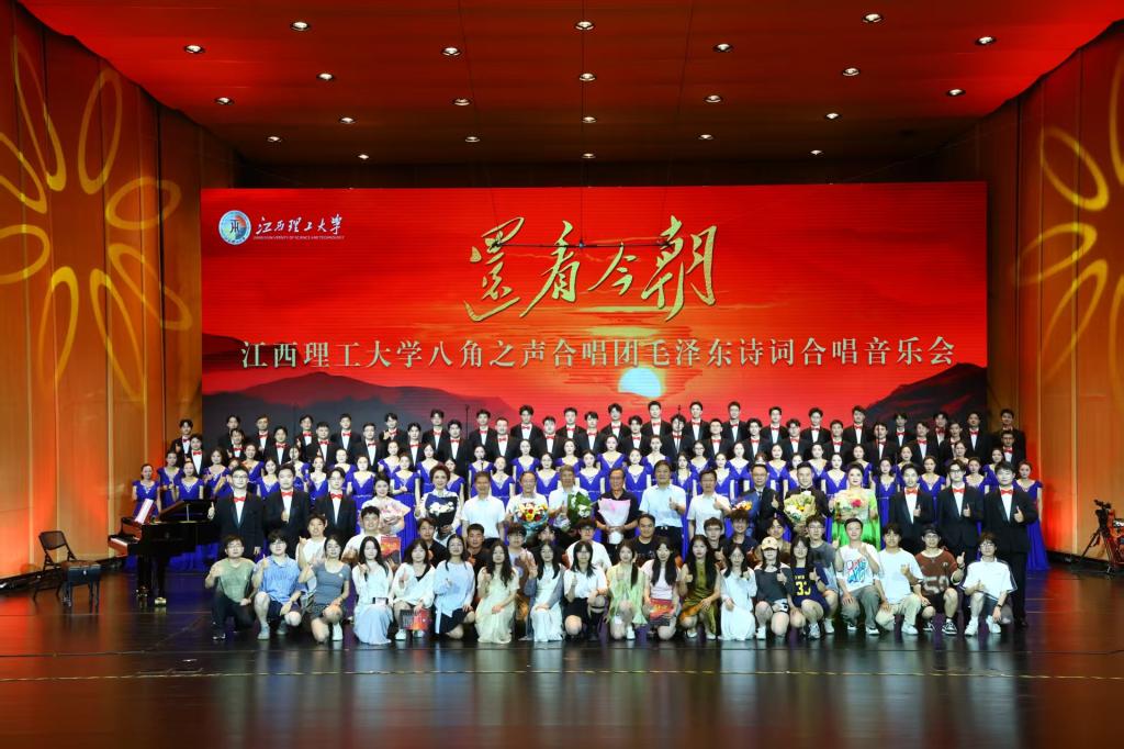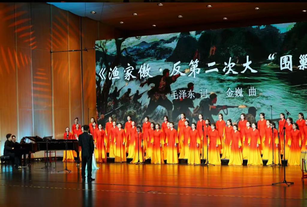 音乐会以毛泽东在江西创作或与江西紧密相关的经典诗词为重点,以历史事件时间为序编排。从《西江月・秋收起义》“军叫工农革命,旗号镰刀斧头”的激昂呐喊,到《沁园春・雪》“俱往矣,数风流人物,还看今朝”的哲思名句,中国革命在江西大地从星火燎原到走向胜利的征程如璀璨明珠般颗粒分明。八角之声合唱团以混声合唱、男声合唱、女声合唱、领唱与合唱等形式,让每一首承载着历史记忆的诗词在和声交织中焕发出独特的艺术魅力,生动勾勒出秋收起义号角、井冈山根据地创建、反“围剿”斗争等鲜活的历史场景,为观众刻画出一幅穿越时空的革命历史长卷。