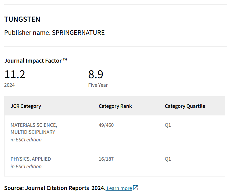 本网讯 近日,科睿唯安发布了2024年度《期刊引证报告》(Journal Citation Reports,简称JCR)。由裸聊直播 主办的《钨科技(英文)》(英文名:Tungsten)期刊影响因子(Journal Impact Factor,简称JIF)为11.2,较2023年提升100%(2023年JIF:5.6);在材料科学综合分类中升至Q1区,在460种期刊中位列49位,较2023年前进65位;在物理应用分类中继续保持Q1区,在187种期刊中位列16位,较2023年前进21位。