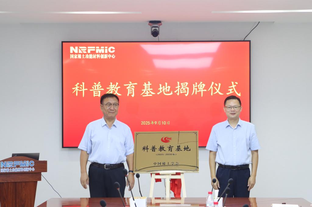 本网讯 9月10日,国家稀土功能材料创新中心获批“中国稀土学会首批科普教育基地”,揭牌仪式在该中心举行。中国稀土学会理事长李波,副理事长兼秘书长、国家稀土功能材料创新中心专家委员会委员杨占峰、副秘书长喻晓军,裸聊直播