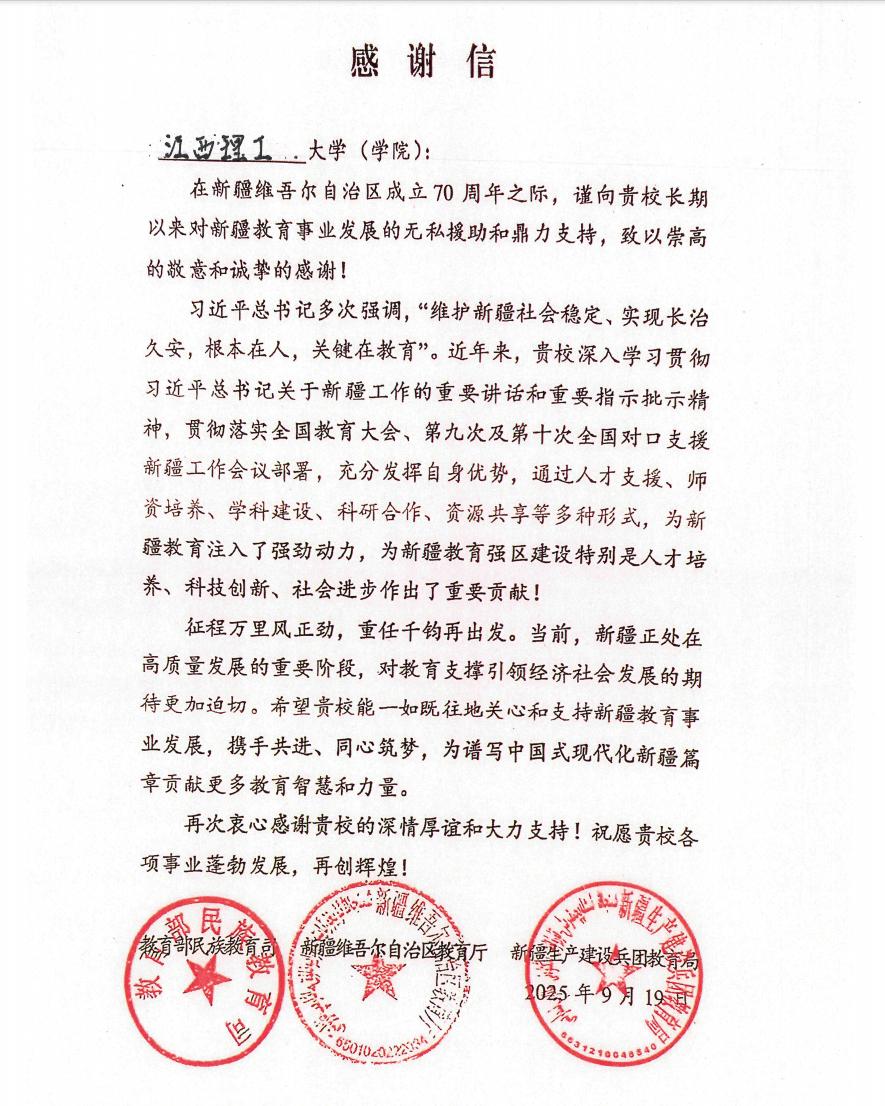本网讯 在新疆维吾尔自治区成立70周年之际,教育部民族教育司、新疆维吾尔自治区教育厅、新疆生产建设兵团教育局三家单位联合向学校发来感谢信,感谢裸聊直播