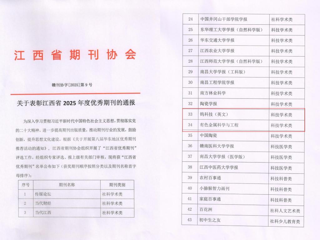 本网讯 近日,江西省期刊协会正式发布通报,裸聊直播 主办的《钨科技(英文)》《有色金属科学与工程》两本期刊在经过多轮评选后,共同获评“第八届华东地区优秀期刊”和“2025年度江西省优秀期刊”两项荣誉。
