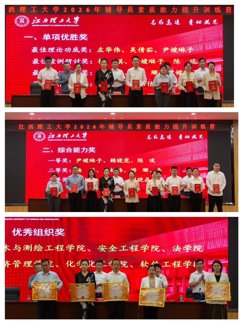 全校辅导员同台竞技、各展所长:基础知识测试以考促学,筑牢政策理论与业务知识根基;学情分析环节聚焦数据挖掘与研判,考验精准育人与风险防控能力;案例研讨现场思维交锋,锤炼综合分析与应急破题能力;谈心谈话环节还原真实育人场景,展现思政教育引导与共情陪伴的专业功底。经过多轮激烈角逐,最终6个学院斩获优秀组织奖,12名选手获单项优胜奖,12名选手获综合能力奖,真正实现了以赛促学、以赛促练、以赛促行。