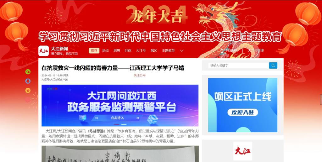 天灾无情人有情,策“马”奔腾共时艰。据悉,地震发生时,马婧还在学校图书馆里学习,得知积石山县遭受地震重创,当即寻求父母的支持,而后她提前完成学习任务,毅然汇入抗震救灾的志愿者行列。当生命与崇高的责任联系在一起便熔熔生辉,马婧在关键时刻豁得出、顶得上、扛得住,以一腔热血践行着“责任为先”的校训,用行动向家乡告白,展现了江理人的精神风貌,也体现了大学生的时代担当。