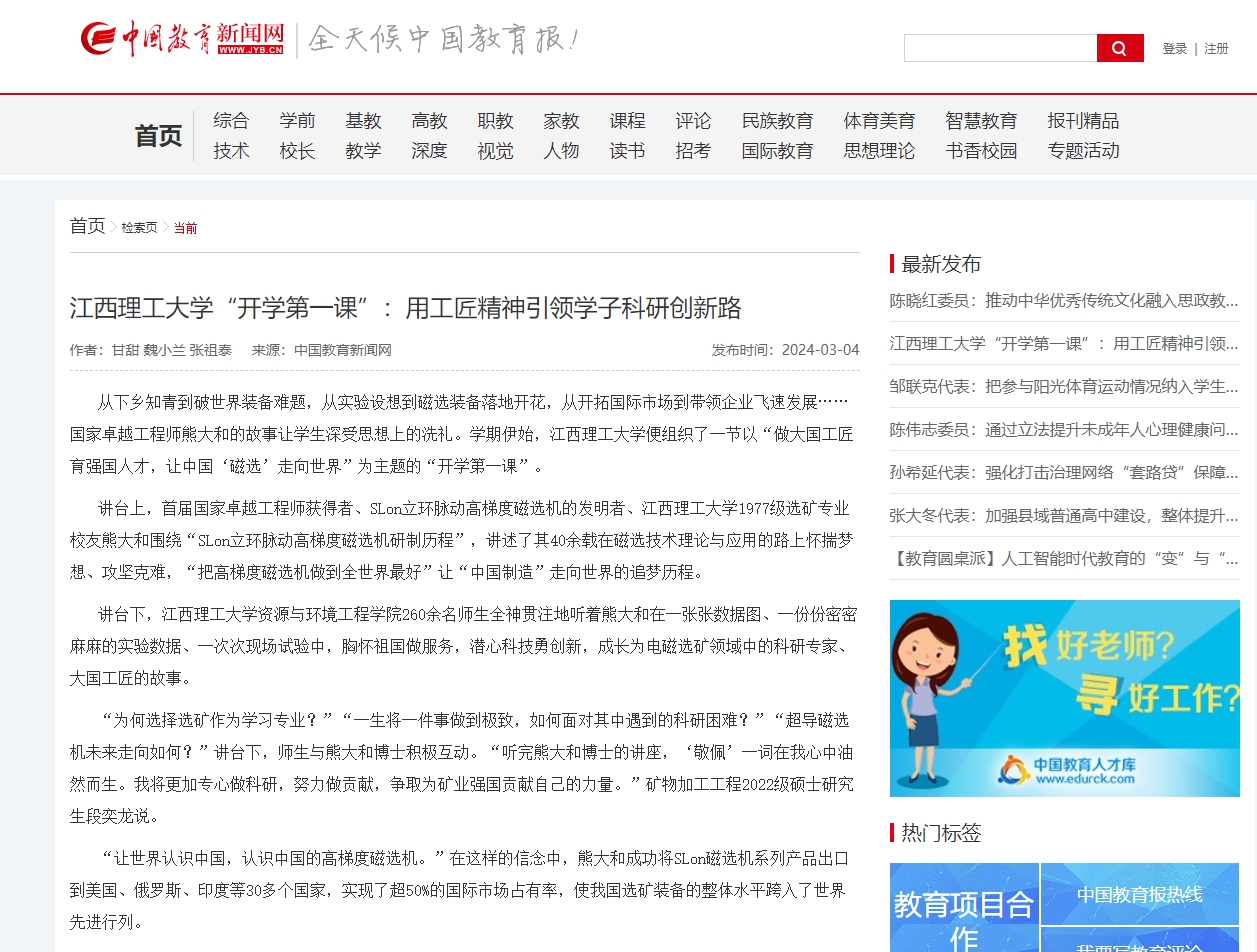 党委副书记罗仙平说到,熊大和博士对于高梯度磁选机的研制过程,实际上也是中国磁选机不断走向世界的历程,他的求学与科研历程,也极大地激励着学生们深入钻研、发展矿业类专业,为保障国家能源资源安全、为全面建设社会主义现代化国家作出贡献。(中国教育报-中国教育新闻网记者 甘甜 通讯员 魏小兰 张祖泰)