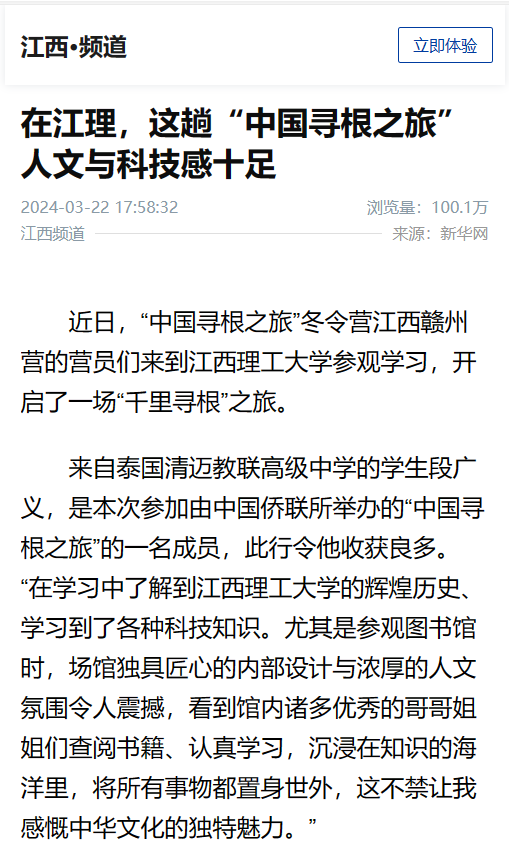 “通过此次参观学习,让泰国学生们更深入、更全面地了解中国、了解江西赣州的历史文化和高等教育发展现状,亲身体验中国高校的教风学风、公共设施、文化设施等,提前感受到了大学校园生活。”赣州市侨联党组书记、主席王孝友表示,希望通过此次“寻根之旅”,可以使华裔青少年种下一颗向往中国、向往江西赣州的种子。