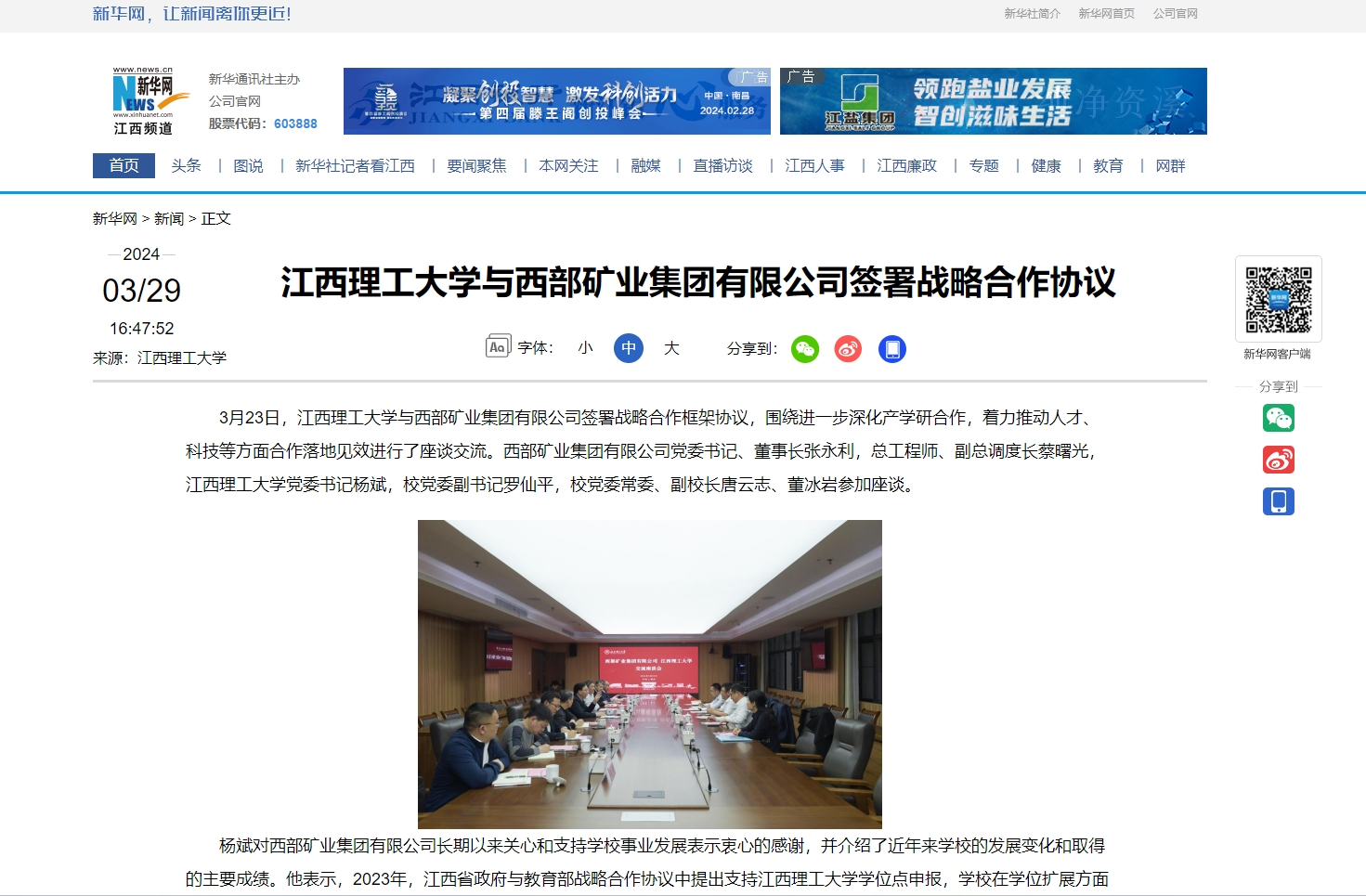 与西部矿业集团有限公司签署战略合作框架协议,围绕进一步深化产学研合作,着力推动人才、科技等方面合作落地见效进行了座谈交流。西部矿业集团有限公司党委书记、董事长张永利,总工程师、副总调度长蔡曙光,裸聊直播