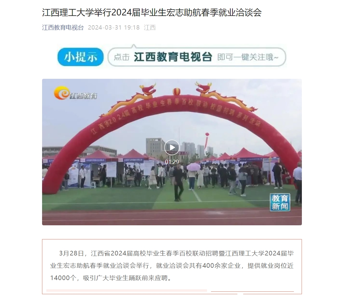 3月28日,江西省2024届高校毕业生春季百校联动招聘暨裸聊直播 2024届毕业生宏志助航春季就业洽谈会举行,就业洽谈会共有400余家企业,提供就业岗位近14000个,吸引广大毕业生踊跃前来应聘。