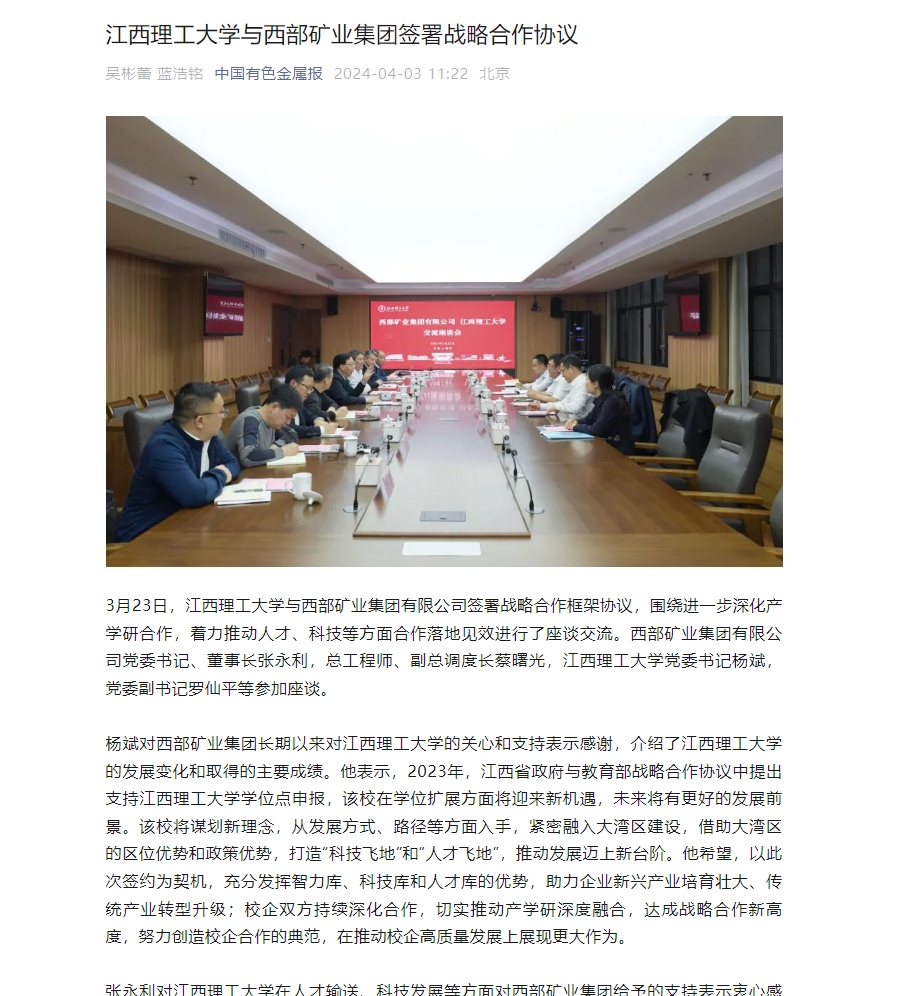 在人才输送、科技发展等方面对西部矿业集团给予的支持表示衷心感谢,介绍了该公司的基本情况。张永利表示,双方具有深厚良好的合作基础,特别在矿产资源高效开发、有色金属材料与新能源智能制造方面有着良好的合作前景,希望双方深化校企合作,精准对接企业的新发展和新需求,培养更多的高素质实用型人才解决企业人才痛点,加强科技项目联合攻关,推进科技成果转化落地,促进企业转型升级,实现互惠互利、合作共赢,为经济社会高质量发展作出更大贡献。