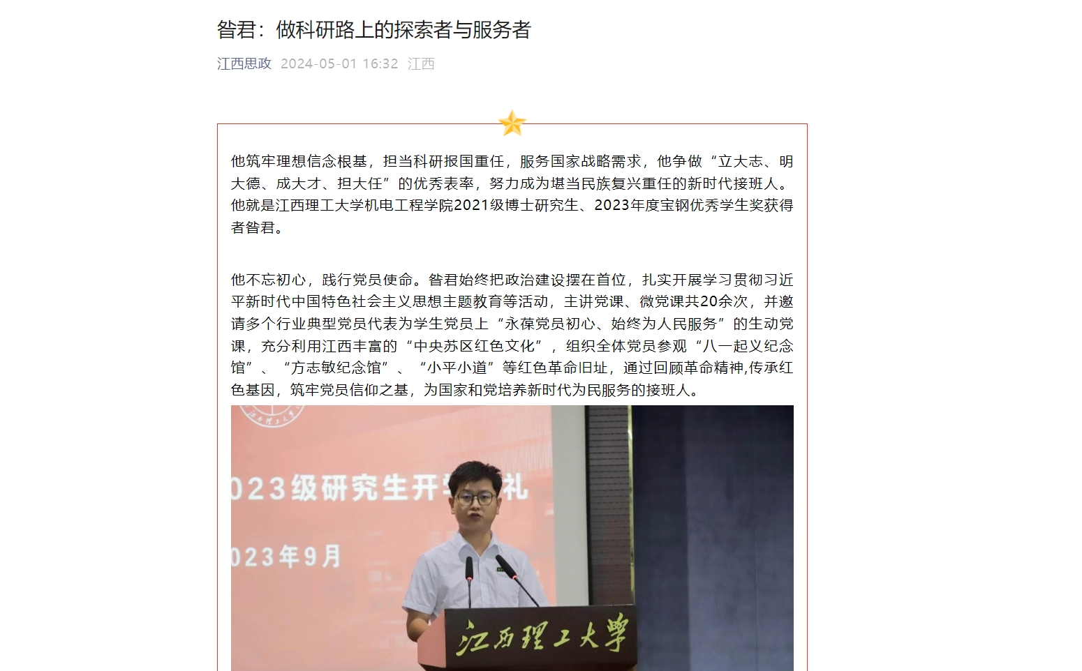 他不忘初心,践行党员使命。昝君始终把政治建设摆在首位,扎实开展学习贯彻习近平新时代中国特色社会主义思想主题教育等活动,主讲党课、微党课共20余次,并邀请多个行业典型党员代表为学生党员上“永葆党员初心、始终为人民服务”的生动党课,充分利用江西丰富的“中央苏区红色文化”,组织全体党员参观“八一起义纪念馆”、“方志敏纪念馆”、“小平小道”等红色革命旧址,通过回顾革命精神,传承红色基因,筑牢党员信仰之基,为党和国家培养新时代为民服务的接班人。