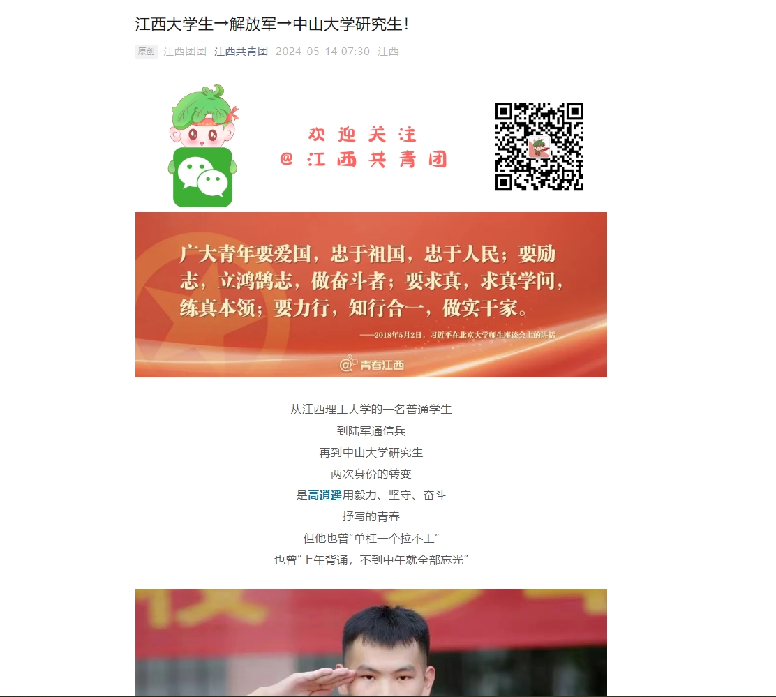 上一条:《人民网江西》:江西大学生→解放军→中山大学研究生! 下一条:《教育部官微》:《新闻联播》报道:牢记嘱托 不断开创新时代思政教育新局面