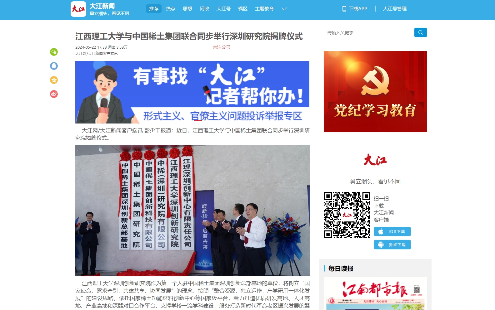 与南山区人民政府签订了战略合作框架协议,与中国稀土集团创新科技有限公司董事长詹伟签订江理(深圳)创新中心有限责任公司(裸聊直播