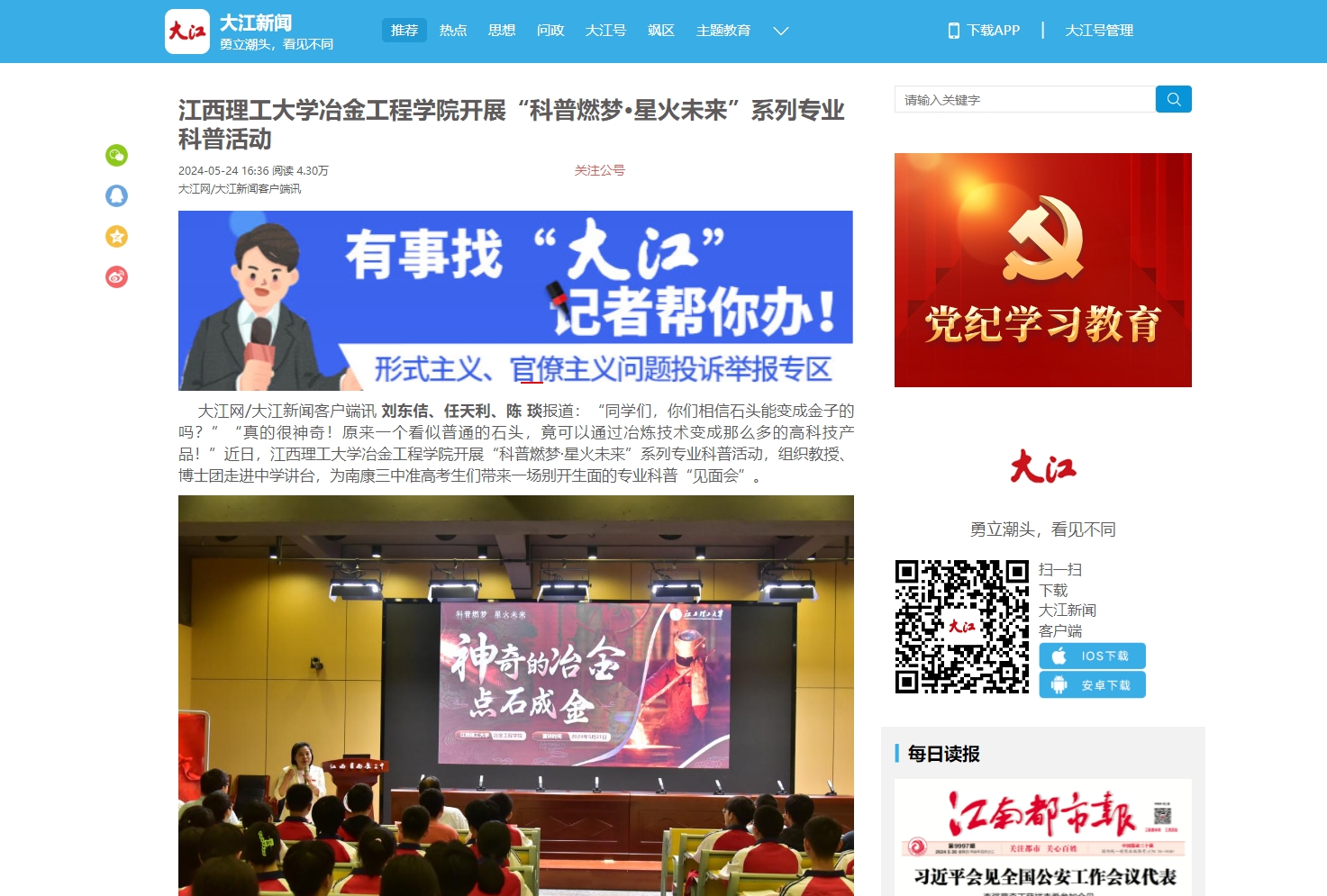 冶金工程学院开展“科普燃梦·星火未来”系列专业科普活动,组织教授、博士团走进中学讲台,为南康三中准高考生们带来一场别开生面的专业科普“见面会”。