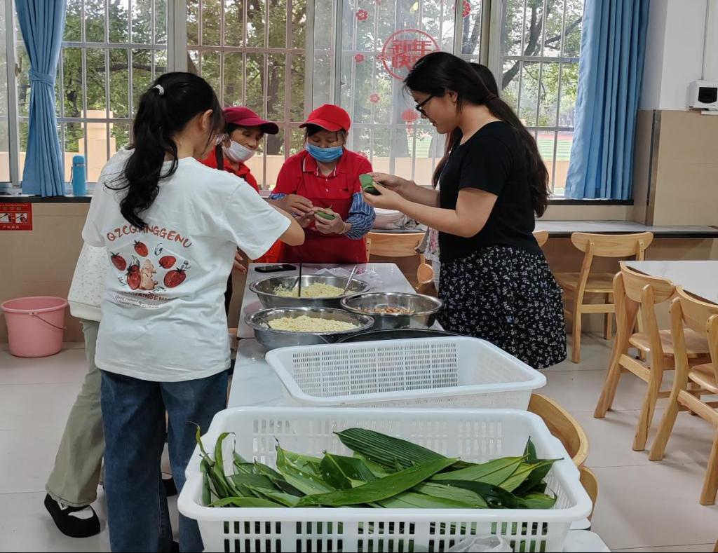 为了让学生感受浓厚的传统节日氛围和学校的温暖关怀,各个食堂还联合学工部组织食堂员工和学生一起进行包粽子活动。洗粽叶、折粽叶、填糯米、放馅料、封口子、扎藤绳……粽叶层层叠叠,包裹着精心挑选的米与馅,满载着欢声笑语。