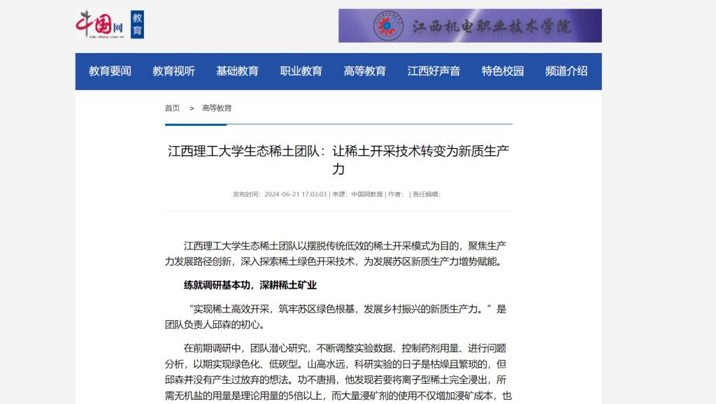 生态稀土团队以绿色开采技术为抓手,科技创新为驱动力,把生态价值转化为绿色生产力,致力于打通束缚新质生产力发展的堵点卡点,探索出“生态+”的创新路,助力赣南苏区高质量发展。