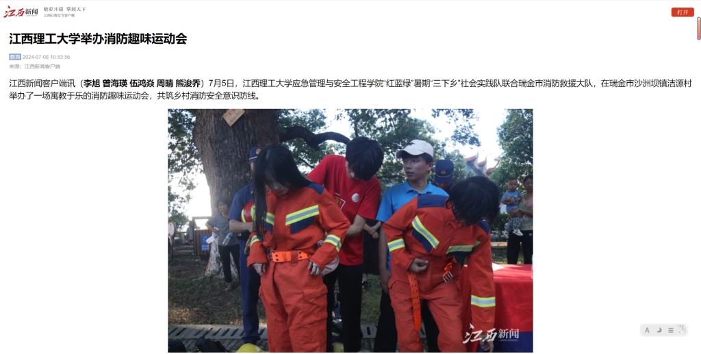 应急管理与安全工程学院“红蓝绿”暑期“三下乡”社会实践队联合瑞金市消防救援大队,在瑞金市沙洲坝镇洁源村举办了一场寓教于乐的消防趣味运动会,共筑乡村消防安全意识防线。