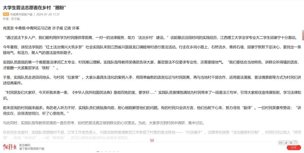 “我们领略了法治视野下业兴、家富、人和、村美,也更有信心用实际行动去践行新时代法学生的责任与担当。”邱康宁说。