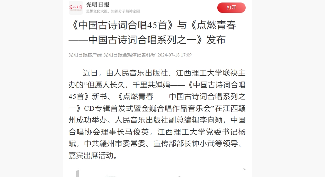 联袂主办的“但愿人长久,千里共婵娟——《中国古诗词合唱45首》新书、《点燃青春——中国古诗词合唱系列之一》CD专辑首发式暨金巍合唱作品音乐会”在江西赣州成功举办。人民音乐出版社副总编辑李向颖,中国合唱协会理事长马俊英,裸聊直播