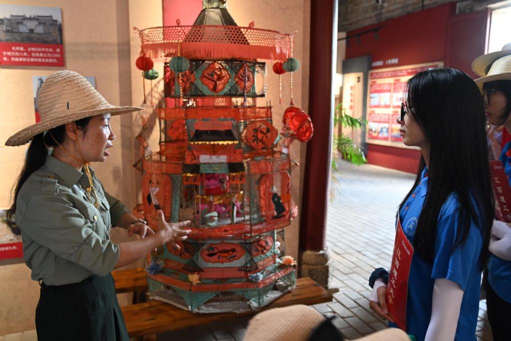 据了解,一个花灯往往需要花费一个月的时间来制作。“这些花灯里面的纸人都是用头发丝绑定的,中心的蜡烛点燃,随着扛灯人的摇晃,里面的纸人也在旋转,就好像皮影戏一样。”文明实践员李油油讲解道。通过细致的讲解,实践队员真切感受到这项传统民俗背后不仅是添丁得子的喜悦,更是鼓乐齐鸣的和谐。