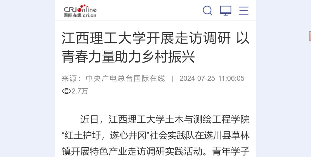 土木与测绘工程学院“红土护圩,遂心井冈”社会实践队在遂川县草林镇开展特色产业走访调研实践活动。青年学子深入基层,了解当下乡镇发展现状,为服务乡村振兴贡献青春力量。