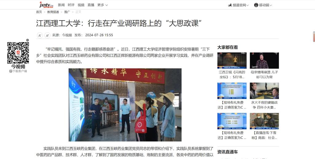 经济管理学院组织安排暑期“三下乡”社会实践团队对江西玉峡药业有限公司和江西正辉新能源有限公司两家企业开展学习实践,并在产业调研中提升综合素质和实践能力。
