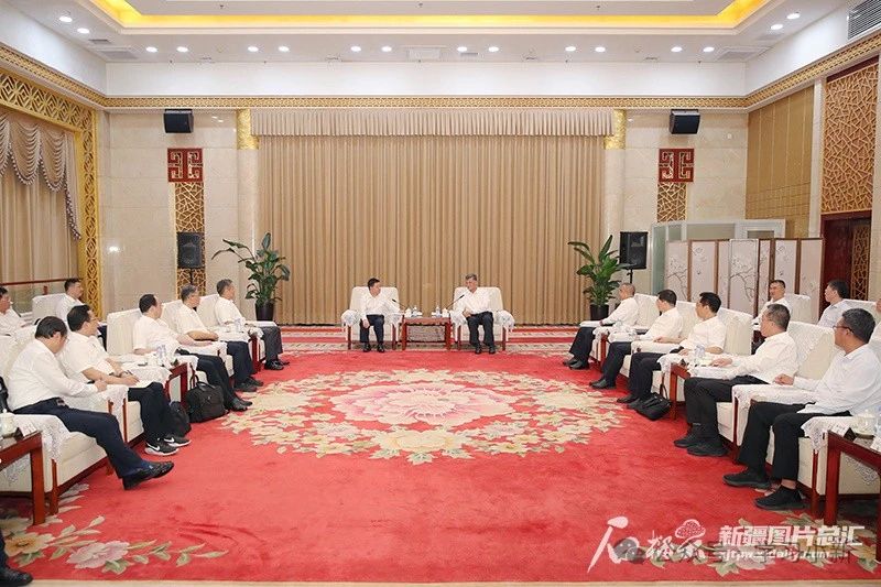8月18日至20日,江西省委副书记、省长叶建春率江西省代表团来新疆考察对接对口支援工作。这是8月18日,自治区党委书记马兴瑞,自治区党委副书记、自治区主席艾尔肯·吐尼亚孜在乌鲁木齐会见代表团一行。石榴云/新疆日报记者 崔志坚摄