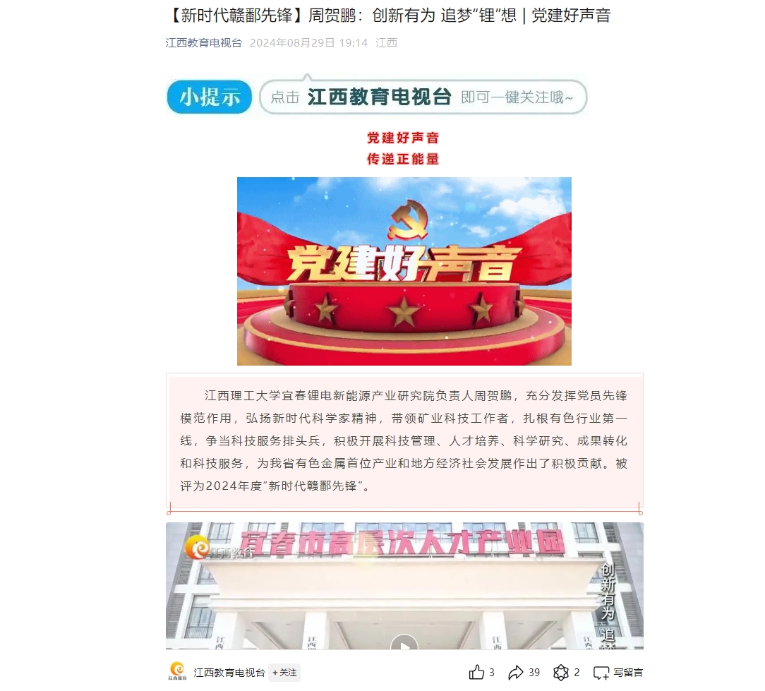 裸聊直播 宜春锂电新能源产业研究院负责人周贺鹏,充分发挥党员先锋模范作用,弘扬新时代科学家精神,带领矿业科技工作者,扎根有色行业第一线,争当科技服务排头兵,积极开展科技管理、人才培养、科学研究、成果转化和科技服务,为我省有色金属首位产业和地方经济社会发展作出了积极贡献。被评为2024年度“新时代赣鄱先锋”。