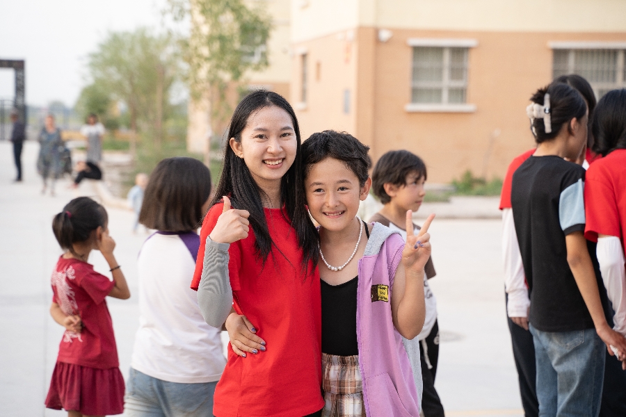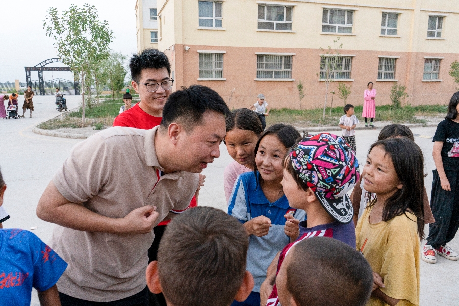图为带队老师与当地孩子交流沟通场景