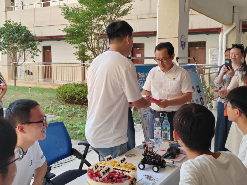 理学院部分领导和辅导员为四名新生送上了生日蛋糕及生日祝福。该院党委书记闫光礼鼓励同学们肩负时代责任,高扬理想风帆,将小我融入大我,做有理想、有追求,有担当、有作为,有品质、有修养的新时代少年。