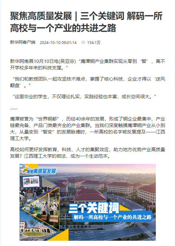 新华网南昌10月10日电(吴亚芬)“鹰潭铜产业集群实现从零到‘智’,离不开学校多年来的科技支撑。”