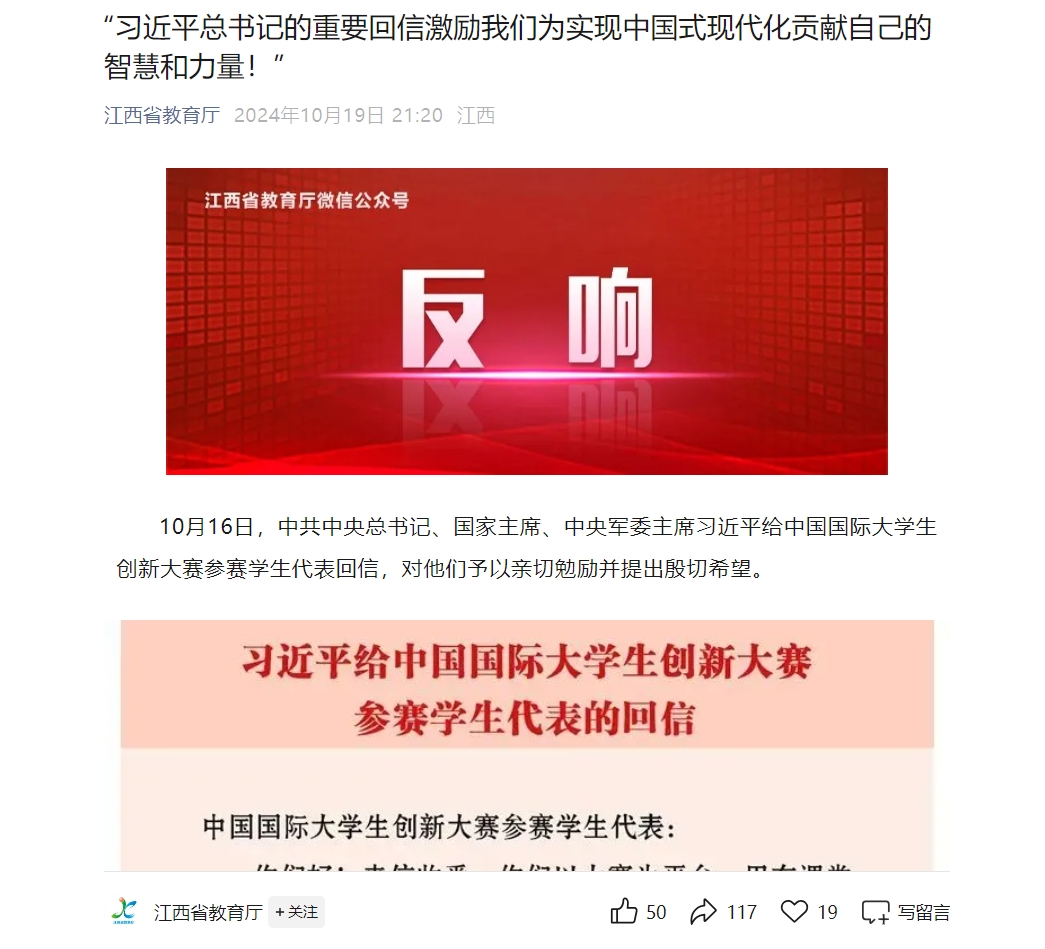 ——习近平总书记给中国国际大学生创新大赛参赛学生代表的回信在江西引起热烈反响