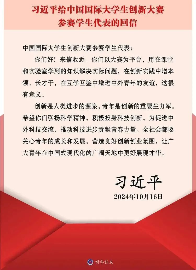 10月16日,中共中央总书记、国家主席、中央军委主席习近平给中国国际大学生创新大赛参赛学生代表回信,对他们予以亲切勉励并提出殷切希望。
