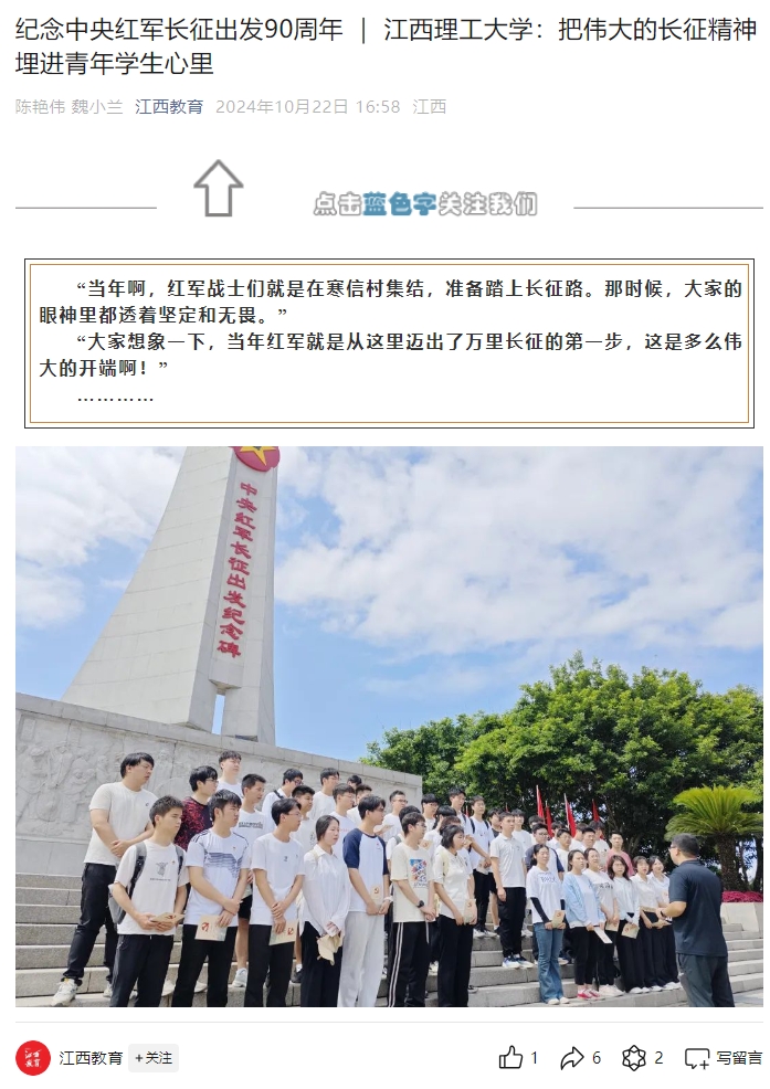 “90年前,同样在于都河畔,一支8.6万人的大军在四天四夜陆续渡河,踏上了震惊世界的远征。一条河,就此与一个民族息息相关。一群人,从此决定了一个国家的命运。”在于都中央红军长征集结出发历史博物馆,师生们瞻仰中央红军长征出发纪念碑、观看情景剧《告别》、聆听革命故事,大家在可视、可听、可感的沉浸式体验中重温革命历史,感受这片土地令人热血沸腾的红色力量。