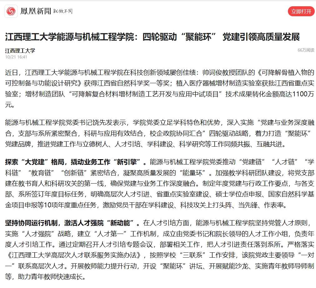 能源与机械工程学院在科技创新领域屡创佳绩:帅词俊教授团队的《可降解骨植入物的可控制备与功能设计研究》获得江西省自然科学奖一等奖;植入医疗器械增材制造实验室获批江西省重点实验室;增材制造团队“可降解复合材料增材制造工艺开发与应用中试项目”技术成果转化金额高达1100万元。