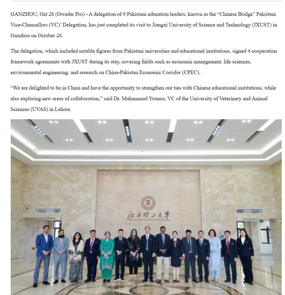GANZHOU, Oct 28 (Gwadar Pro) - A delegation of 9 Pakistani education leaders, known as the “Chinese Bridge” Pakistani Vice-Chancellors (VC)’ Delegation, has just completed its visit to Jiangxi University of Science and Technology (JXUST) in Ganzhou on October 26.