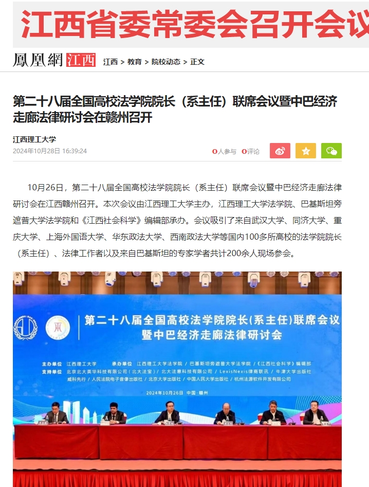 法学院、巴基斯坦旁遮普大学法学院和《江西社会科学》编辑部承办。会议吸引了来自武汉大学、同济大学、重庆大学、上海外国语大学、华东政法大学、西南政法大学等国内100多所高校的法学院院长(系主任)、法律工作者以及来自巴基斯坦的专家学者共计200余人现场参会。