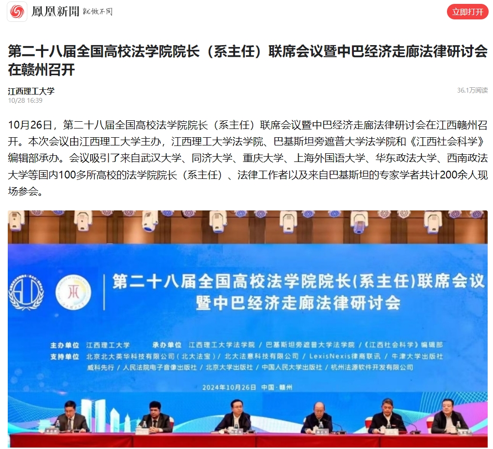 法学院、巴基斯坦旁遮普大学法学院和《江西社会科学》编辑部承办。会议吸引了来自武汉大学、同济大学、重庆大学、上海外国语大学、华东政法大学、西南政法大学等国内100多所高校的法学院院长(系主任)、法律工作者以及来自巴基斯坦的专家学者共计200余人现场参会。