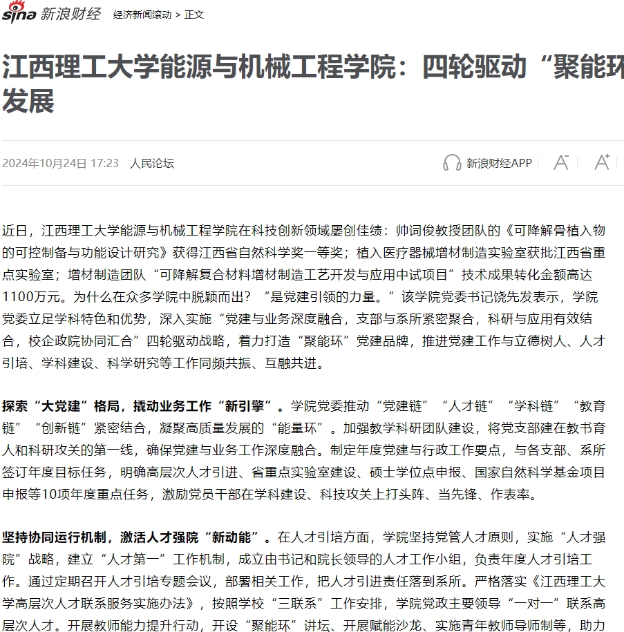 能源与机械工程学院在科技创新领域屡创佳绩:帅词俊教授团队的《可降解骨植入物的可控制备与功能设计研究》获得江西省自然科学奖一等奖;植入医疗器械增材制造实验室获批江西省重点实验室;增材制造团队“可降解复合材料增材制造工艺开发与应用中试项目”技术成果转化金额高达1100万元。为什么在众多学院中脱颖而出?“是党建引领的力量。”该学院党委书记饶先发表示,学院党委立足学科特色和优势,深入实施“党建与业务深度融合,支部与系所紧密聚合,科研与应用有效结合,校企政院协同汇合”四轮驱动战略,着力打造“聚能环”党建品牌,推进党建工作与立德树人、人才引培、学科建设、科学研究等工作同频共振、互融共进。